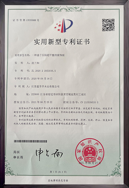 為了打造多元化市場,2014年,沈蘭知創建了江蘇藍羊羊裝飾材料有限公司,業務拓展至高檔防水建筑模板生產,“藍羊羊集團”初具雛形。征地一百多畝,建成廠房3萬平米,建設12條自動化生產線,日產模板2萬余張,專利技術超20項,品牌影響力日益增強。